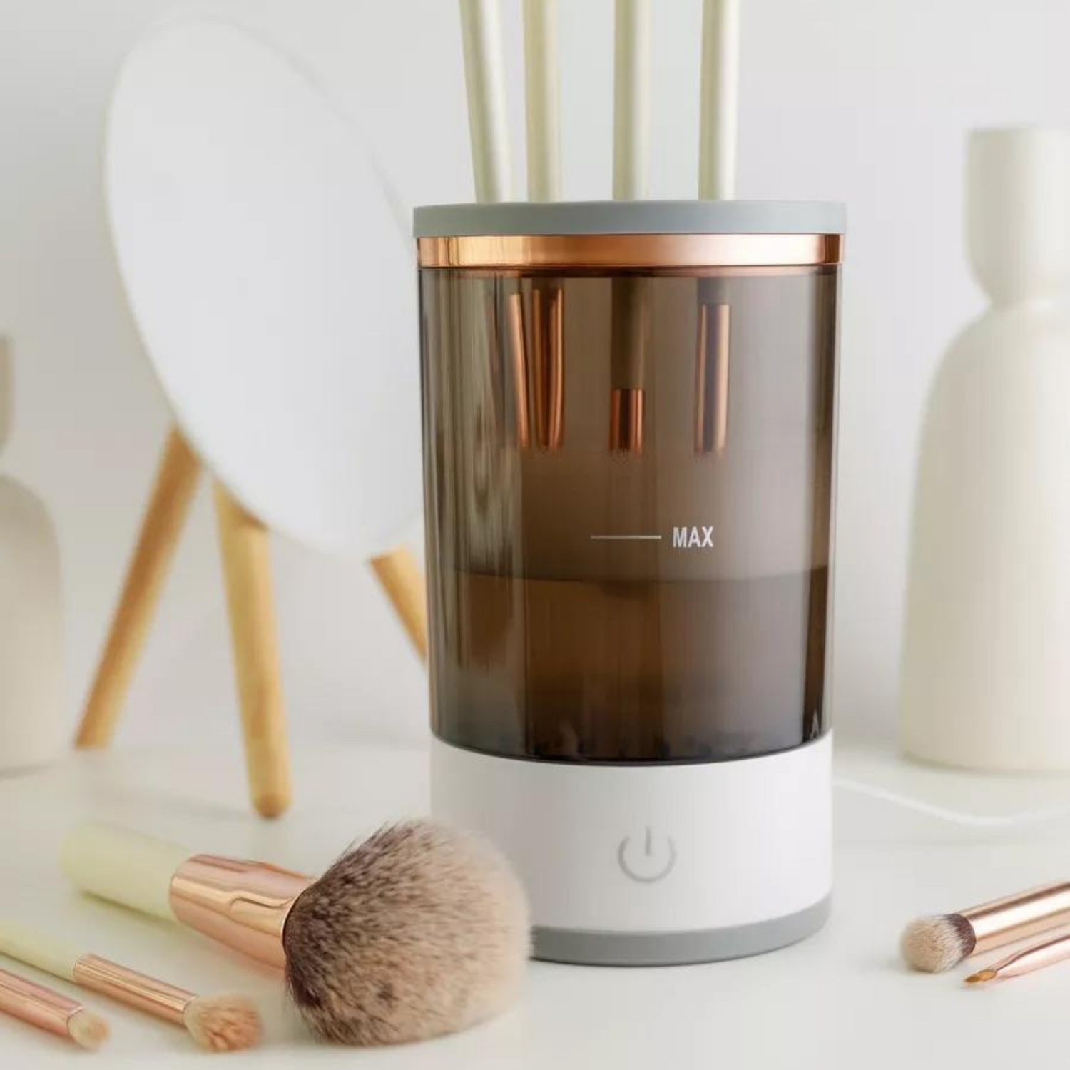 Med automatisk børsting, stram stangen og på et minutt for ren, hygienisk børsting. Og bare rotajonfunksjonen til den fine makeupartisten er effektiv, mens kosmetologen nå har bakterier. Fleksible silikonholdere er designet for å tåle børsting og alle typer støv og skitt.